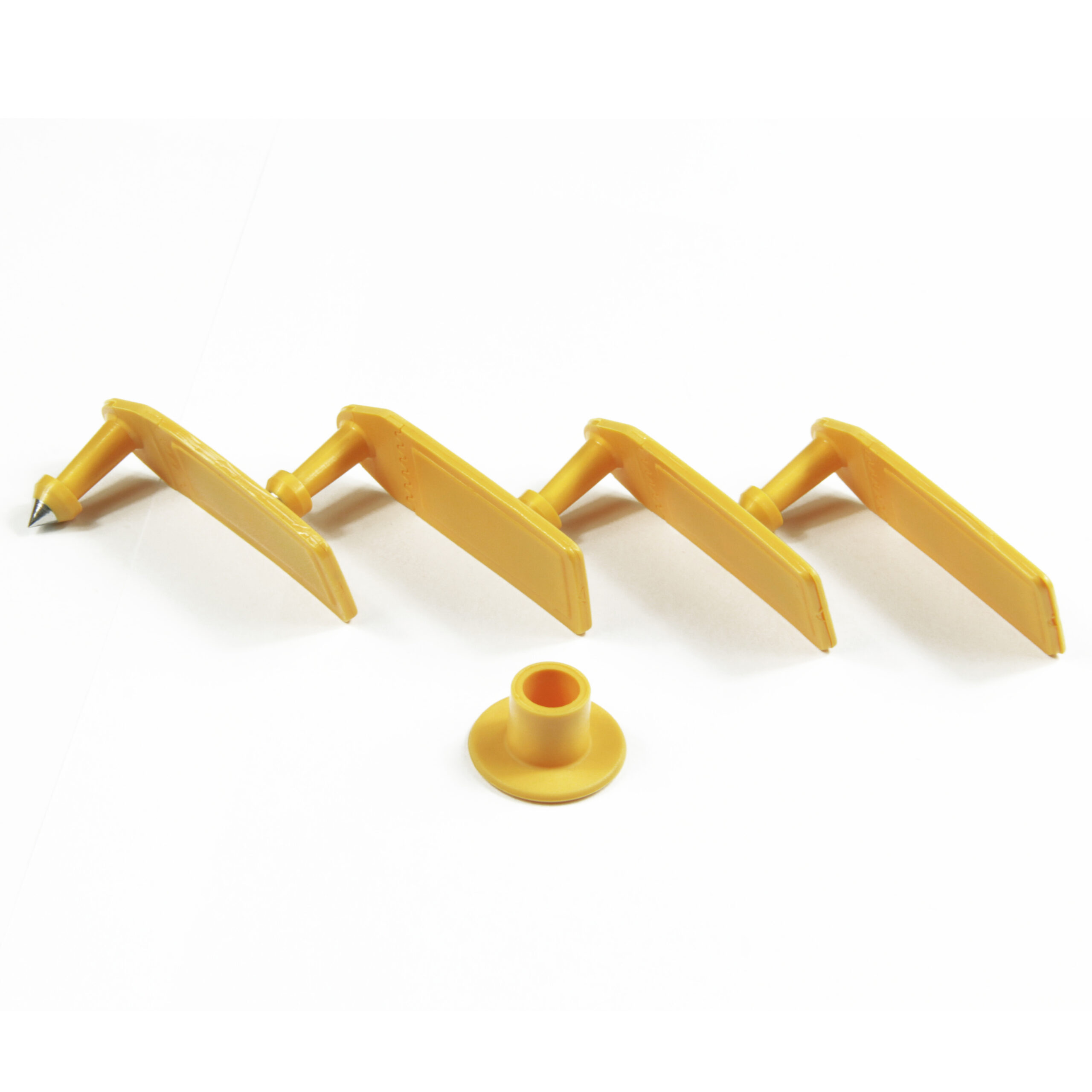 Tag telinga plastik tahan lama dan tersedia dalam berbagai warna. Tag ini ringan dan tidak membahayakan atau membuat kambing tidak nyaman.